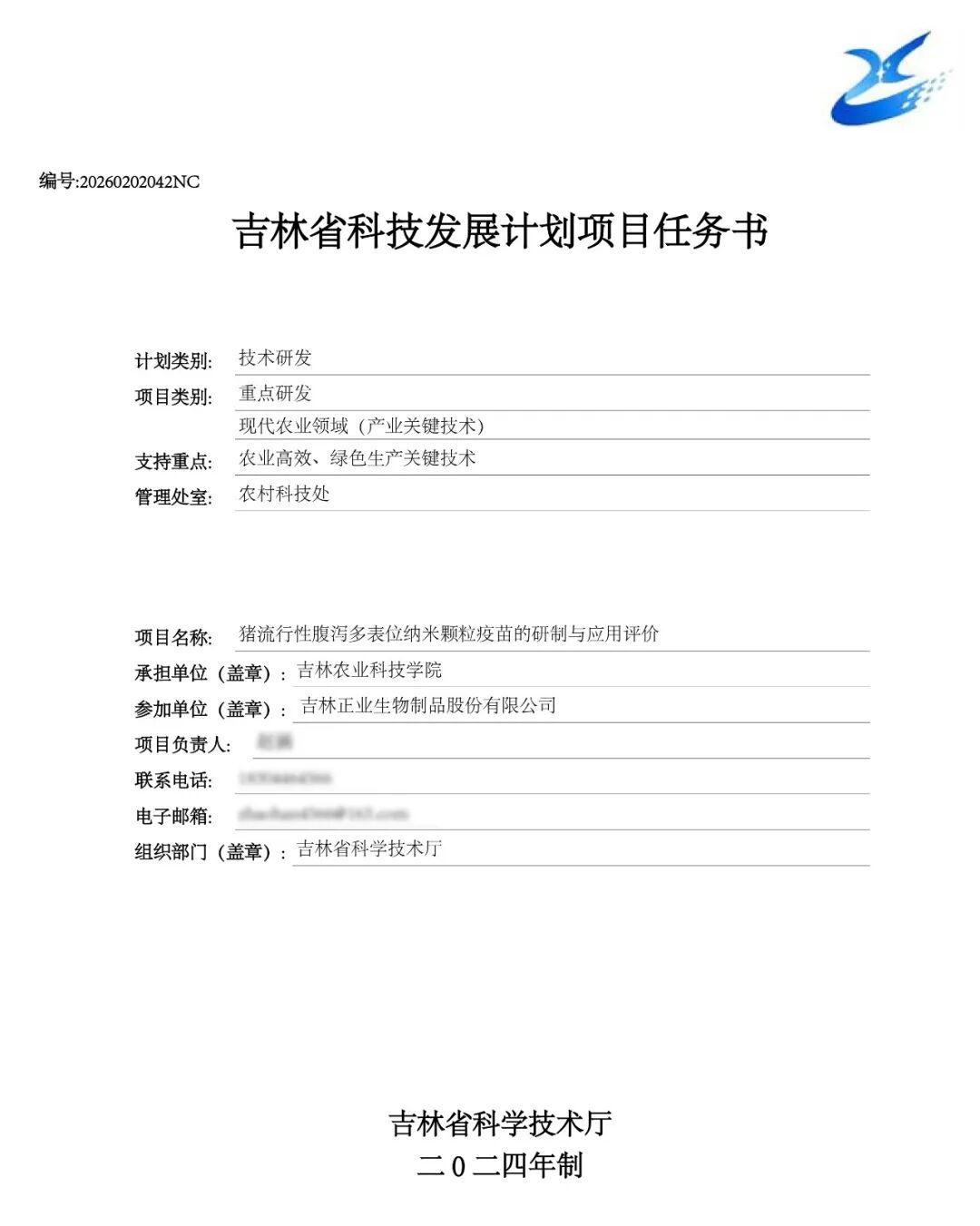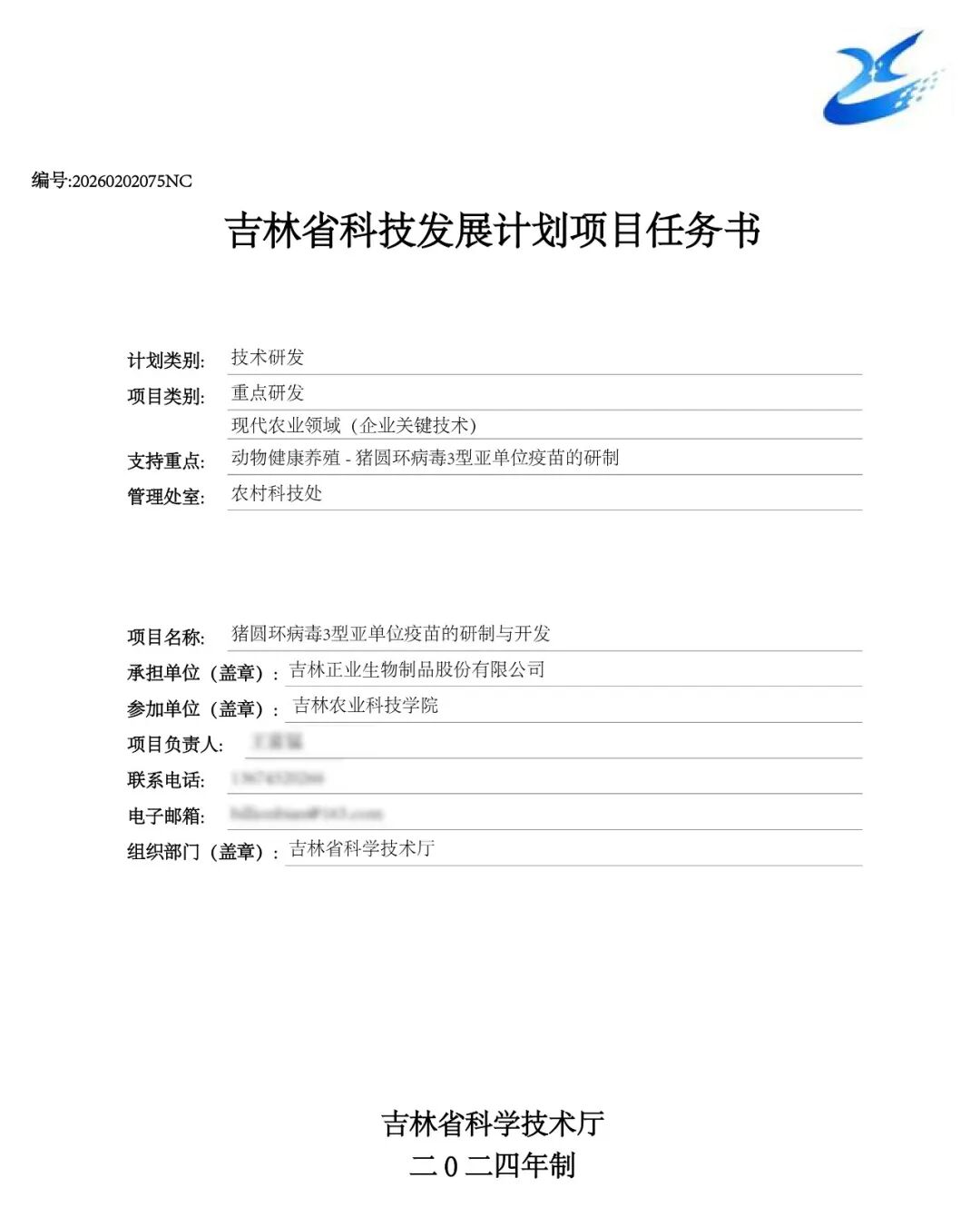 近日,吉林省科学技术厅组织签订 “吉林省科技发展计划项目任务书”,由吉林正业生物制品股份有限公司(以下简称“正业生物”)作为承担单位,联合吉林农业科技学院共同实施的“猪圆环病毒3型亚单位疫苗的研制与开发” 项目被确立为2026年度吉林省科技发展计划重点研发项目,任务书编号:20260202075NC。这标志着正业生物在兽用生物制品科技创新与产业转化领域,再次肩负起破解行业关键难题、引领现代农业发展的时代使命。