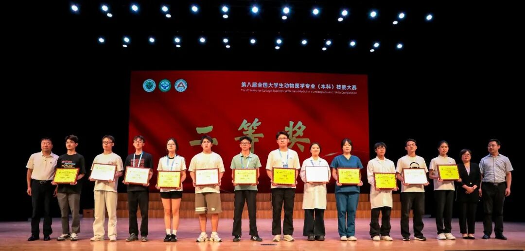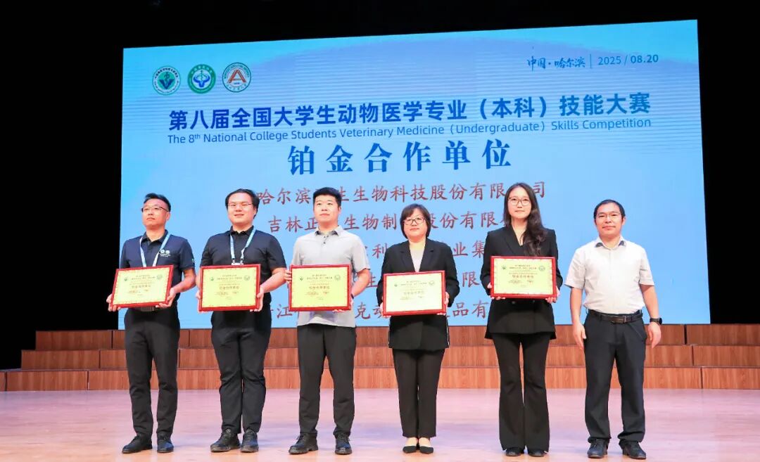 在第八届全国大学生动物医学专业(本科)技能大赛闭幕式上,正业生物副总经理程玉红与多家企业代表共同为二等奖获奖选手颁奖。随后,正业生物被组委会授予“铂金合作单位”称号。